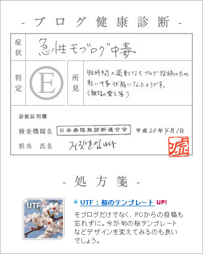 エイプリルフールの限定イベントはネット上でもさまざま行われますが、このJUGEMでは「ブログ健康診断」を実施しているようです。